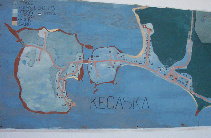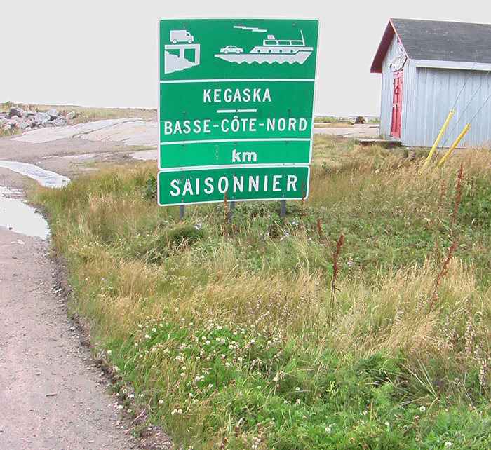 La pancarte ci-dessous informe sur la difficulté de l’entreprise consistant à relier des communautés isolées autour de l’estuaire du Saint-Laurent. Sur la Côte-Nord, la route qui part de Québec passe par la ville de Sept-îles, 25.000 habitants. continue jusqu’à Natashquan et vient se terminer à Kegaska, un village de pêcheurs qui compte à peine 150 habitants. Quand j’ai fait le périple Rimouski – Blanc-Sablon, en 2011, la route s’arrêtait à Natashquan. Elle a gagné 60 kms en ralliant Kegaska. Les communautés villageoises situées plus à l’est de ce hameau sont privées de transport routier. Pour passer d’un village à l’autre, il faut soit passer par le bois, la taïga et la toundra, soit attendre l’été et embarquer sur le bateau qui ravitaille les villages un à un.