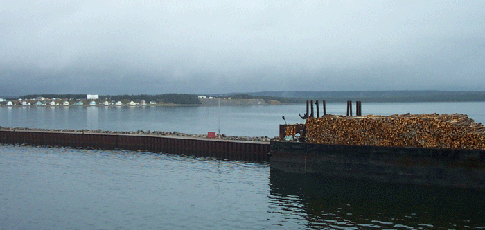 Passage de la forêt à la taïga puis à la toundra. À Port-Menier, sur l'île Anticosti, transformation du bois. Les billes de bois sont appelées des pitounes. La dernière photo prise sur le quai au matin donne l'ambiance de notre escale !